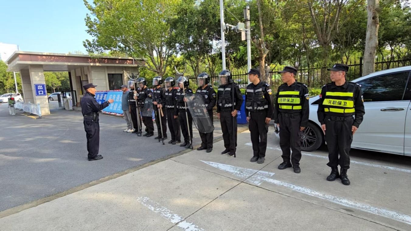 演习中,执勤门卫发现2名神情异常人员欲混入校园,坚决阻止其进入。“暴徒”受阻后强行闯岗,一人持凶器恐吓门卫,一人持凶器强行闯入校内。门卫呼叫增援,并利用岗位上防暴器械进行阻挡。处突快速反应小组迅速出击,利用盾牌、钢叉、警棍等警具,成功制服“暴徒”并移交警方。
